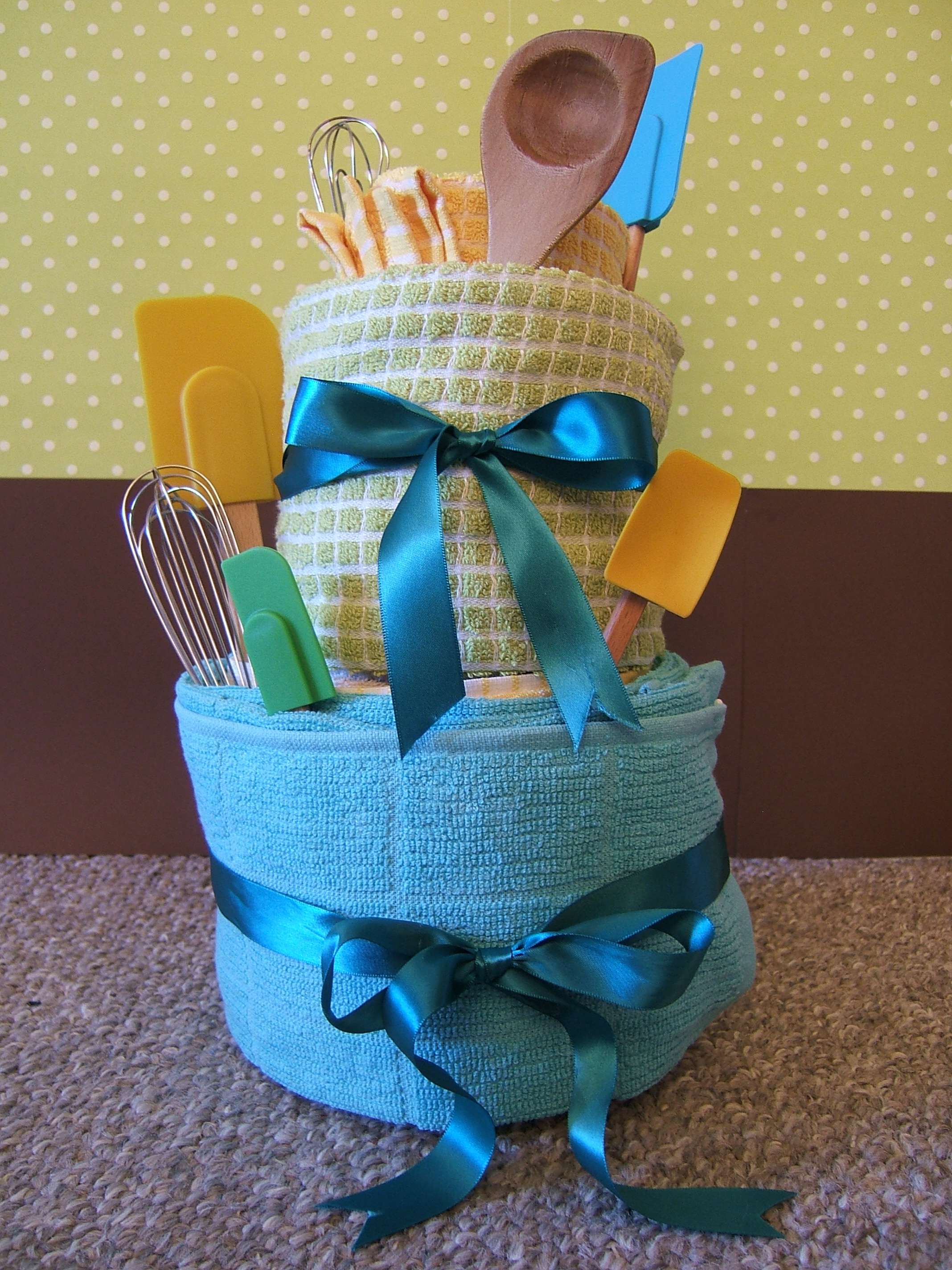 This next gift idea is the easiest of all. Roll dish towels in spirals, stack, insert a dowel for stability, pin and tie with a ribbon. Insert spatulas, whisks and wooden spoons, perfect present.