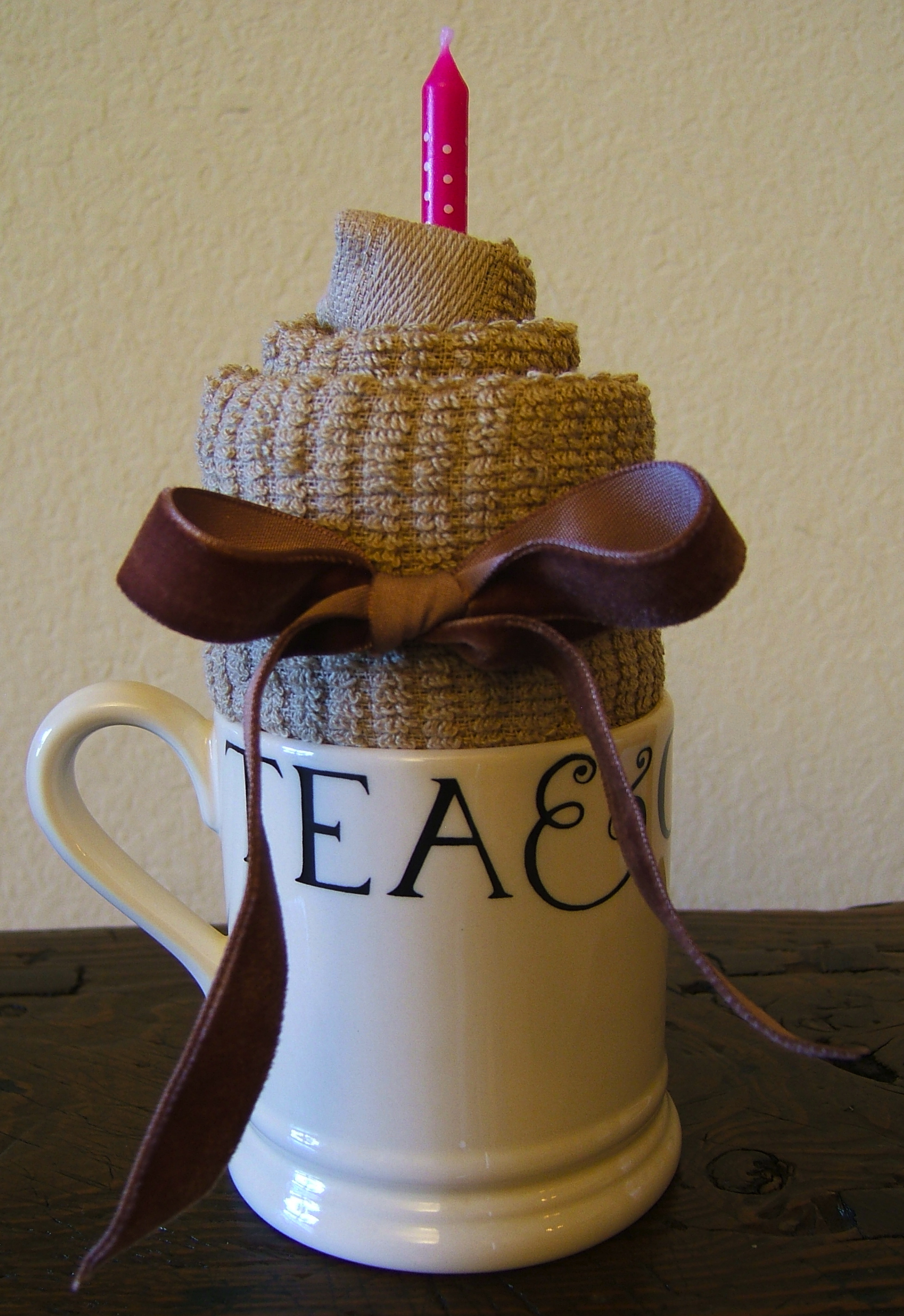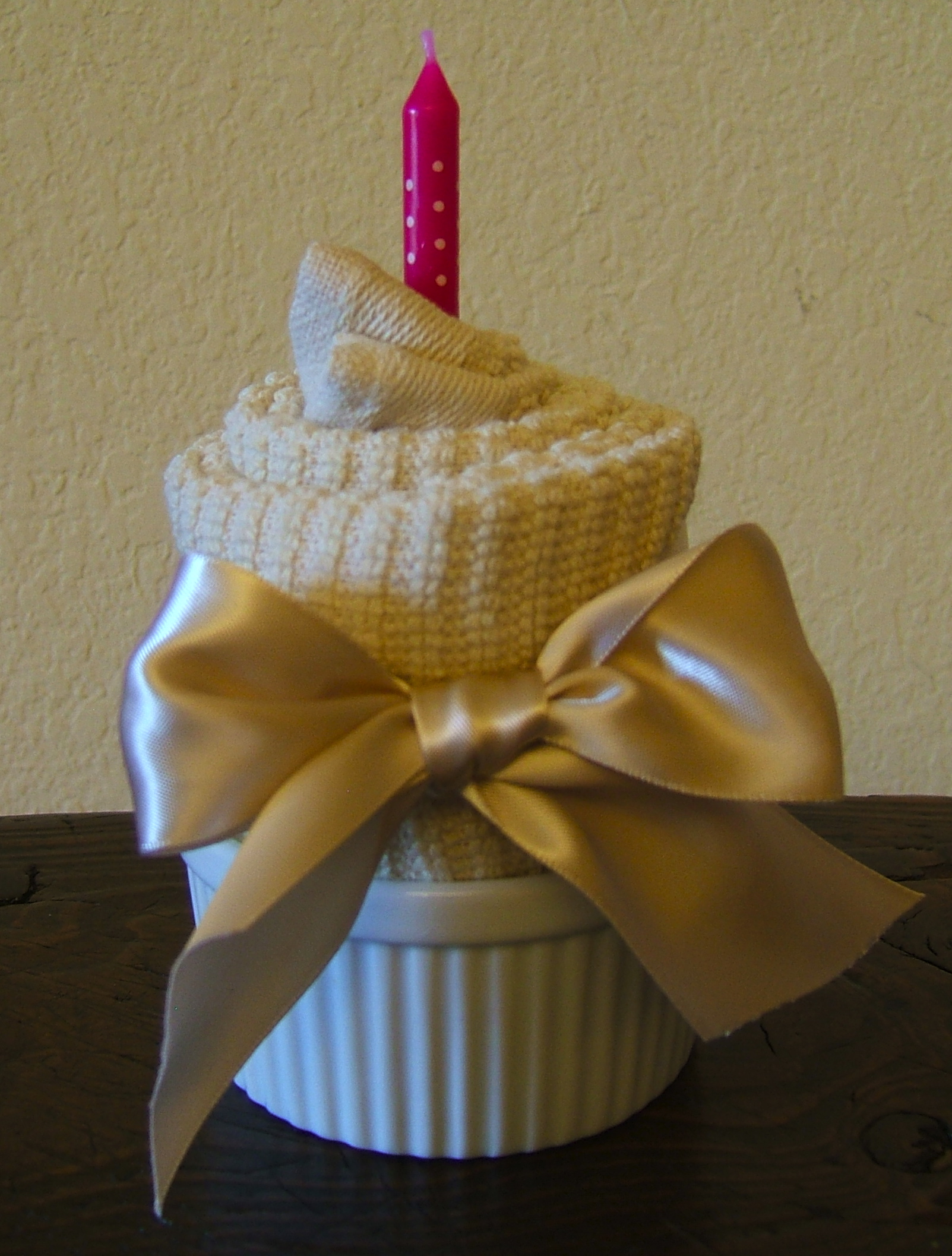 Starting on one end, fold up the edge in a triangle — the way you would begin folding a flag — so that it sticks up slightly above the towel fold. From there, roll the towel in a spiral, slightly pushing the center up. This way the tip of the cupcake is raised. Secure with a straight pin if necessary, add a birthday candle, and tie with a ribbon.