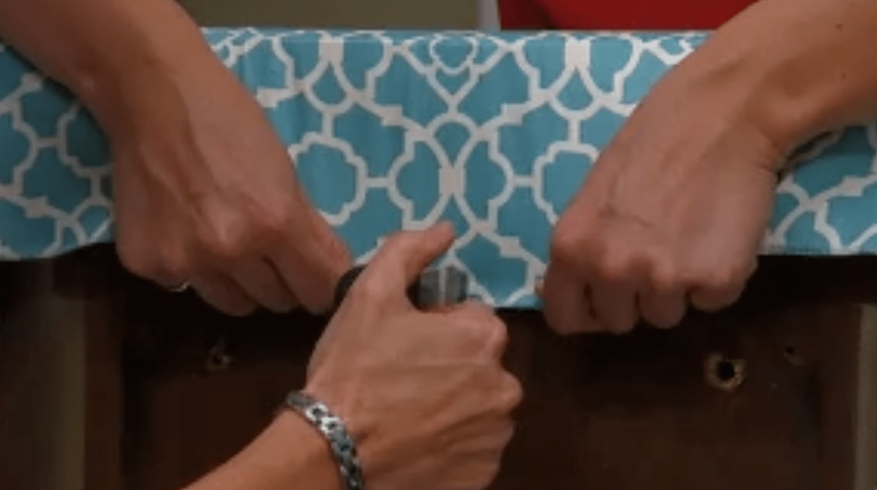 Start on the long sides of the table and staple from the center out, pulling the fabric taut as you go. Watch your fingers! Staple within about 6″ of the corners, then work on the short sides, in the same manner.