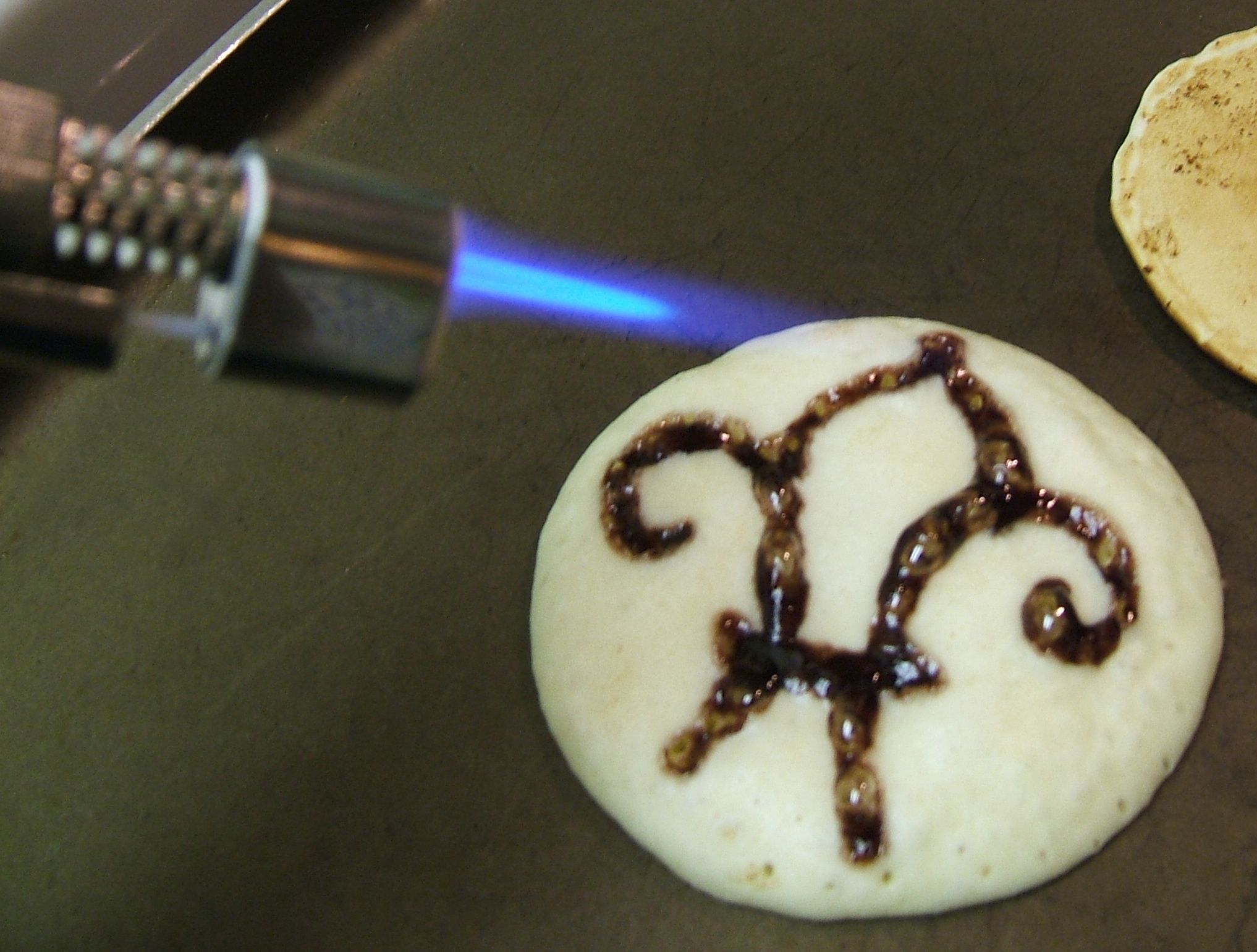 Now. Here’s the tricky part. When I flipped the first few pancakes, the jelly smeared. To prevent this, I took out my handy kitchen torch, and applied heat to the uncooked side of the pancake, until the surface was cooked just a little. When the ‘gloss’ of the batter was cooked away, it was ready to flip, and no longer smeared.